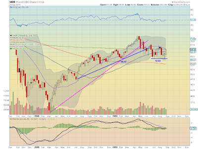 The bull move in the QQQQ is the strongest of the equity index ETF's. There is no Hanging Man creating uncertainty, but rather a Three Advancing White Soldiers pattern that is very bullish. It stopped it s run today near resistance of the 100 day SMA. There is resistance higher at 46.25 followed by the 47 area. Support on a pullback comes first at the 200 day SMA and then the 45.00 to 45.25 area. The weekly chart adds to the bull case printing a Bullish engulfing candle that drove through both the 20 week and the 50 week SMA's which will now act as support. the weekly adds resistance higher at 48, and support points lower at 44 followed by 42.46.